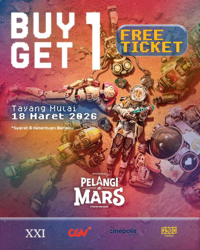 Saksikan momen bersejarah ini bersama keluarga mulai hari ini, 18 Maret 2026. Manfaatkan promo spesial Buy One Get One Free (BOGOF) yang tersedia di aplikasi M-TIX, TIX ID, CGV, dan Cinepolis.Untuk informasi lebih lanjut mengenai jadwal tayang dan konten eksklusif, silakan ikuti akun resmi di @pelangidimars dan @mahakaryapictures!